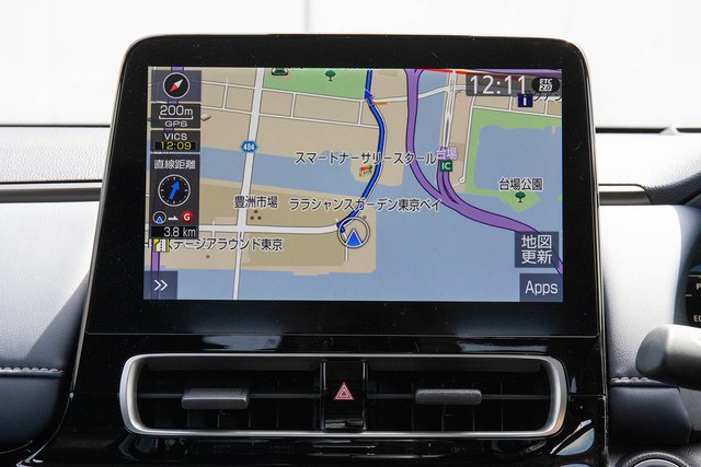 アクアに搭載されていたDAは、ディスプレイサイズを10.5インチとし、アプリ上の操作はすべてタッチ操作で行える仕様が標準装備されていた。カーナビとしてはCarPlayやAndroid Autoのナビアプリに対応できるが、試乗車にはディーラーオプションのナビキットが装備されており、操作ボタンで「MAP」を押すことでいつでもこのナビモードに切り替わるようになっていた。