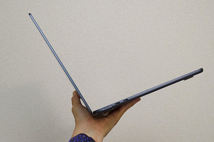 新しいMacBook Airでは、本体の厚さ(=薄さ)は約1.13cm。最も厚い箇所が1.61cmになるM1搭載MacBook Airと、スペックを見る限り寸法はさほど変わらないように思えるが、実機は見た目に、そして手に取ってみても前機種よりも薄くなったように感じる。