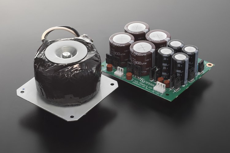 回路から筐体まで変更点は多岐にわたり、共通する要素はごくわずかにとどまるという。特に、8Ω負荷で300W、1Ωで2400Wというとてつもないパワーの源泉となる電源部は3000VAの電源トランスを中心に構成されており、その存在感は半端ではない。