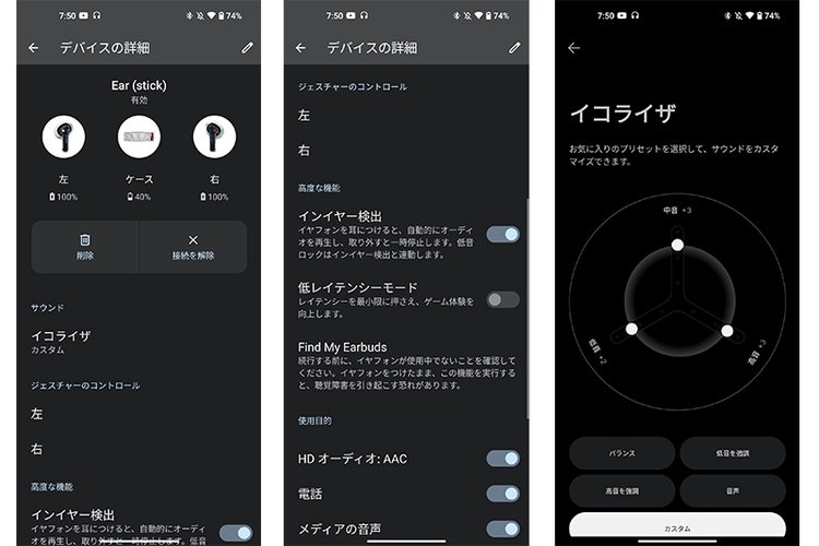 Ear (stick)登場とあわせて進化する予定のアプリ「Nothing X」を使うと、イヤホンのEQ調整も可能に。基本設定のバランス、プリセットは低音/高音をそれぞれ強調したものと声を強調する3種類を用意。加えてカスタムも可能で、低音/中音/高音の3バンドを±6段階で調整できる。