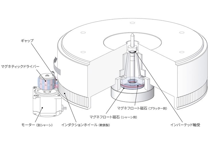 一方、プラッター下部の円周上には、歯車のような、軟鉄による凹凸を162式設置した。これをマグネティック・インダクション・ホイールと呼び、前述の18極のマグネティックドライバーとわずかな間隙を設け、非接触で同ドライバーが近接回転すると、その磁力によりプラッターが回転する仕組みだ。