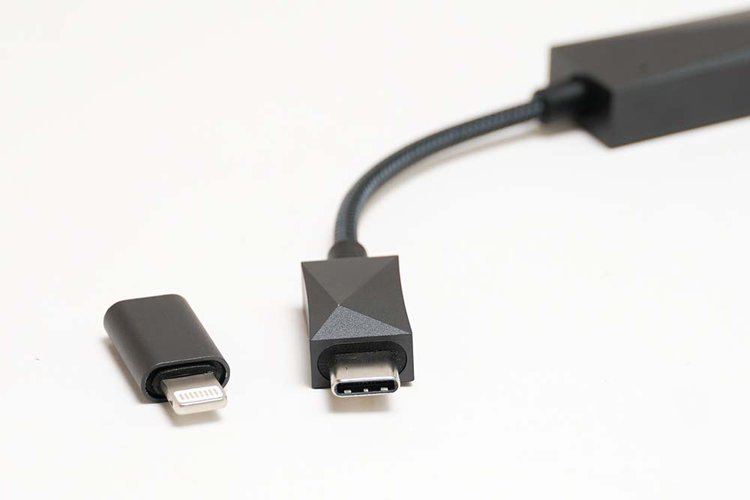 再生機器との接続用にUSB-C端子を備え、Androidスマホはもちろん、付属の「USB Type-C to Lightning変換アダプター」を使えばiOSでも利用できる。また、Windows PCやMacにも対応し、接続すればバスパワーで駆動する。端子がつながるケーブルにもこだわり、「高耐久性デュアルノイズシールドケーブル」を採用。ノイズの干渉を極限まで抑える工夫がいくつも凝らされている。出力端子は使い勝手のよい4極の3.5mmステレオミニを採用する。通話にも対応し、ゲームのボイスチャットやテレワークにも重宝する。(※iOSデバイスは付属のアダプター使用では通話に非対応)