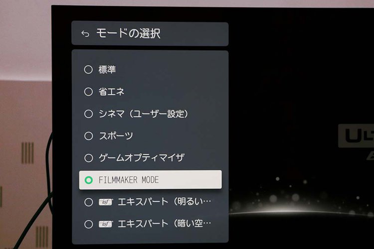プレーヤーを接続し、4K Ultra HD Blu-ray(UHD BD)でも確かめる。まずはディスプレイ視聴の定番ソフト『8K空撮夜景SKYWALK』。この場合、HDR映像モードが自動選択される。「あざやか」「標準」「シネマブライト」「シネマダーク」「ゲームオプティマイザ」「FILMMAKER MODE」の6種類から選ぶことができるが、本機の推しとなるのが「FILMMAKER MODE」だ。