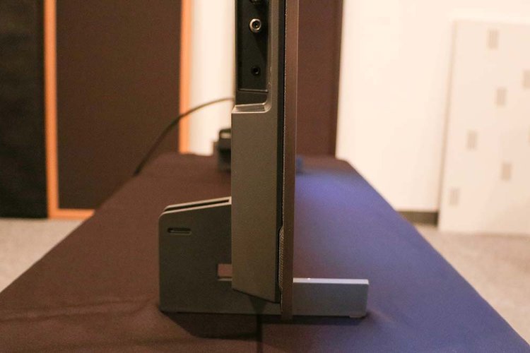 OLED42C2PJAを視聴した。実機で印象的なのは、潔いまでのミニマリズムの追求だ。薄い。ベゼルが非常に細く、オンにすれば映像だけが浮かび上がる。そして、抱えてみると軽い。中画面サイズの場合、動かしやすいことは重要だ。リビングやダイニングでも活躍するサイズだが、パーソナルなスペースに持ち込むこともできる。55インチ以上だとそうはいかない。