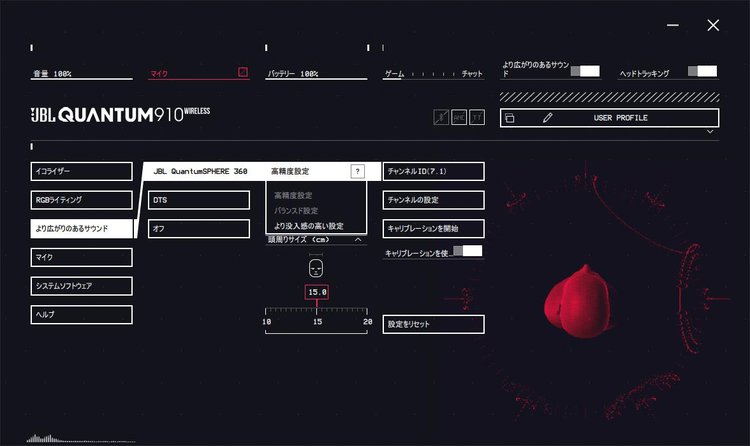 そしてサウンドは、JBLのBluetoothスピーカーやイヤホンでも馴染み深い、パワフルな低音が主体のバランス。しかし本モデル最大の魅力が発揮されるのは、2.4GHz接続時に利用できる空間オーディオ機能をオンにしたときだ。Windows PCと接続する際はバーチャル7.1chの「JBL QuantumSPHERE 360」、macやPlayStation、Nintendo Switchと接続する際は2.0chの「JBL QuantumSpatial 360」となる(記事執筆時点ではXBOXのみ非対応)。