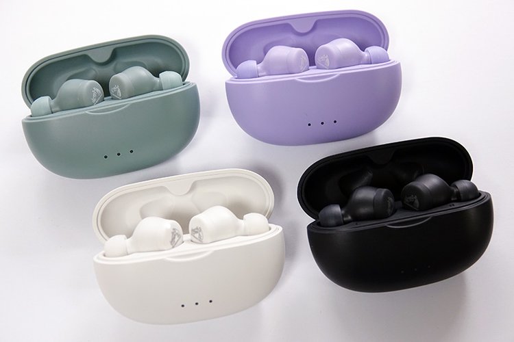 イヤホンはスティック型。繭のようなラウンド形状の充電ケースは手の中に心地よく馴染む。そのデザインは一見すると女性のユーザーをターゲットにしているようにも見えるが、スタイリッシュなパステルカラーのブラックやグリーンのモデルは男性ユーザーが使っていても違和感はないと思う。女性の音楽ファンにはパープルが注目されそうだ。