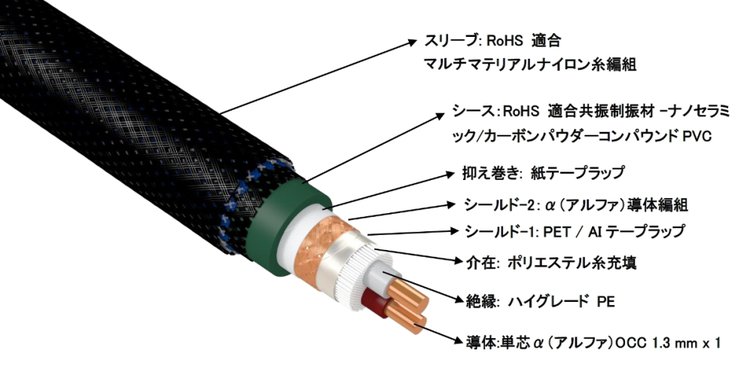 ケーブル導体は、同社ケーブルの定番であるαプロセス処理(超低温+特殊電磁界処理)を施したαOCCの単芯で、接点部はホット/コールドともにαOCCロジウムメッキ。さらにシールド編組にもαプロセス処理が施されている点がトップエンドモデルの証。また、シース内にナノセラミック/カーボンパウダーPVCを封入している点も見逃せない。絶縁体は高級ポリエチレン製である。