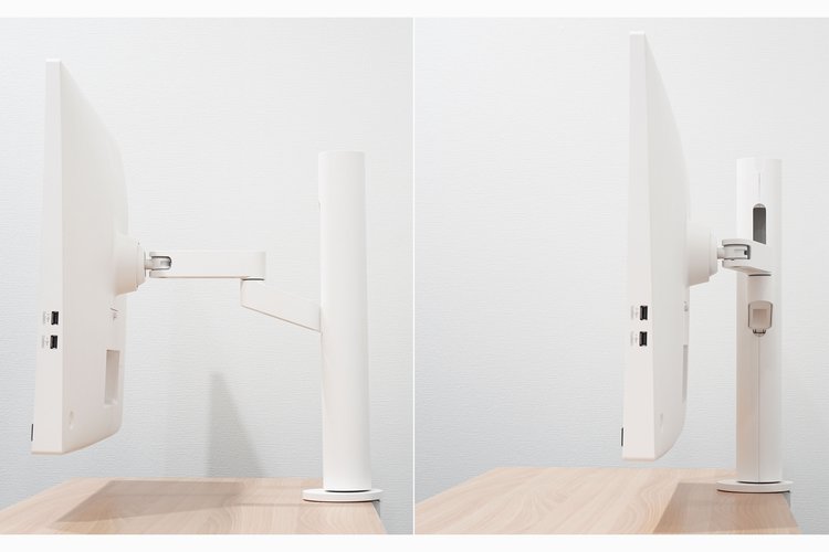 32SQ780S-Wならではの仕様が、独自のアームスタンド「エルゴノミックスタンド」。スイベル、ピボット/チルト/高さ調整に対応。上下や左右、上向き/下向きなど、幅広い範囲で滑らかにアームが動き、ディスプレイの位置を柔軟に配置可能だ。