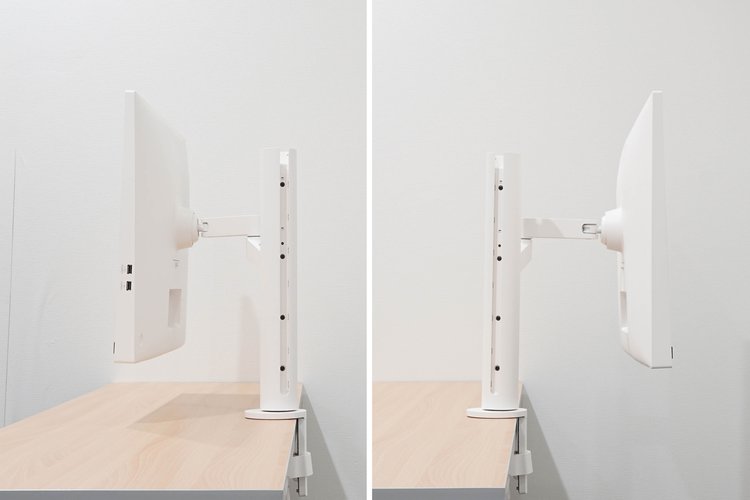 32SQ780S-Wならではの仕様が、独自のアームスタンド「エルゴノミックスタンド」。スイベル、ピボット/チルト/高さ調整に対応。上下や左右、上向き/下向きなど、幅広い範囲で滑らかにアームが動き、ディスプレイの位置を柔軟に配置可能だ。