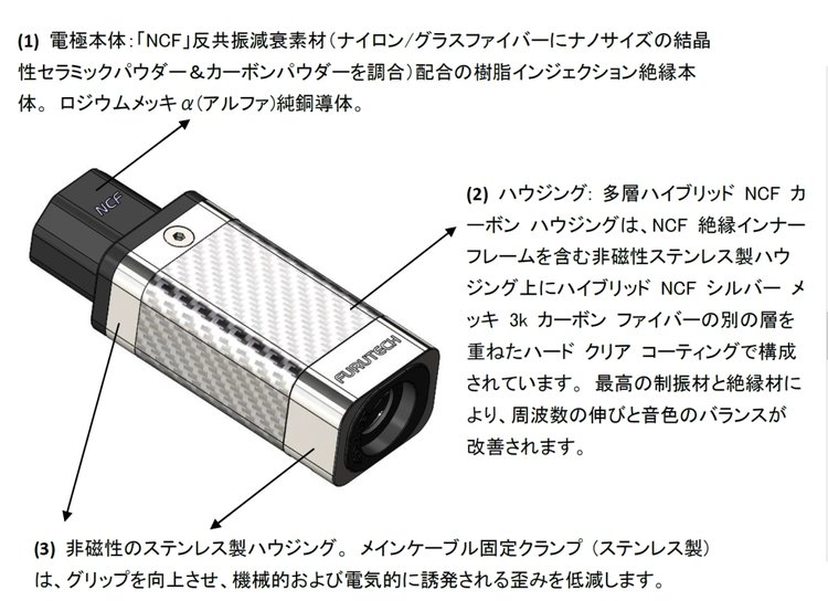 技術的内容はとても語り尽くすことができないほど盛り沢山だ。型番が示す通り、静電気対策特殊素材「NCF」を、振動対策用のナノサイズセラミック&カーボンパウダーと共にナイロン/グラスファイバーに調合してプラグ随所に使用しているだけではない。NCF絶縁インナーフレームを含む非磁性ステンレス鋼ハウジング上に、ハイブリッドNCFシルバーメッキ3kカーボンファイバーの層を重ね、最外層にはハードクリアコート。電極部はロジウムメッキした純銅α導体である。