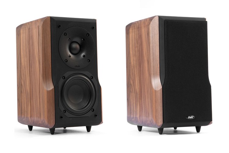 今回はコンパクトでスタイリッシュなイタリアン・オーディオをテーマとしています。従って、スピーカーには、チャリオのLynxを選びました。実際に目にすると、両サイドのウォルナット無垢材の木目が実に美しいです。その他のキャビネット部分は、マットなブラック仕上げのHDF材(高圧縮木繊維板)です。ある程度、異種素材で振動を抑えながら、天然木による響きの良さを失わないようにしているようです。バスレフポートは底面にあり、リビングのサイドボードに直置きできるように、ラバーフットも装備され、専用スタンドも発売されています。