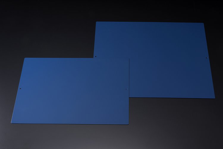 さて本作「D-RENシート」は落ち着きあるブルーの制振鋼板だ。厚さ1.4mm鋼板で0.8mmと0.6mmを特殊技術でプレスしたものだ。