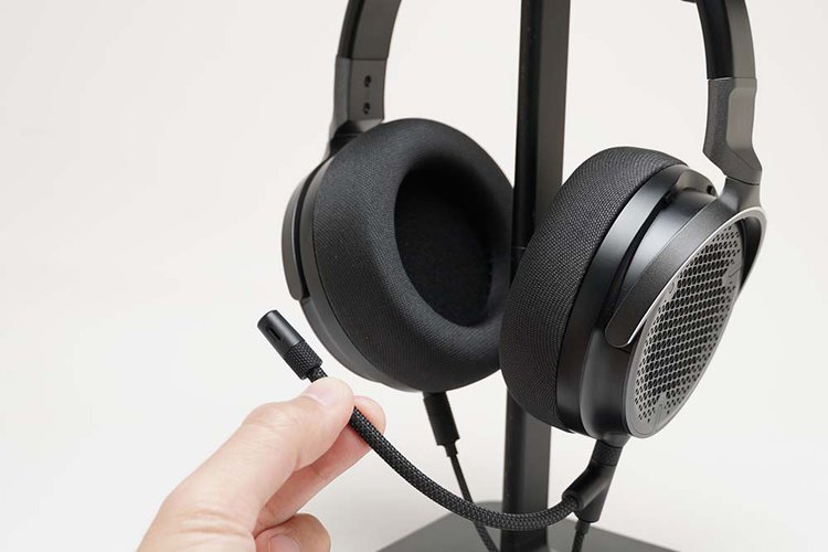 ブームマイクは、声を狙って捉える単一指向性のもの。マイクのアーム部は芯に針金のような素材を用いており、任意の角度に曲げて形を保持できる。比較的柔らかいので、簡単に口元に近づけたり、遠ざけたりしやすい。ブームマイクの付け根の端子との分岐部分にスライド式のスイッチがあり、瞬時にミュートが可能となっている。