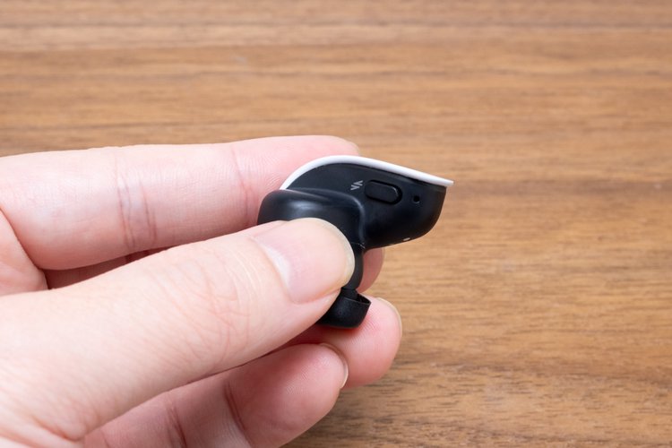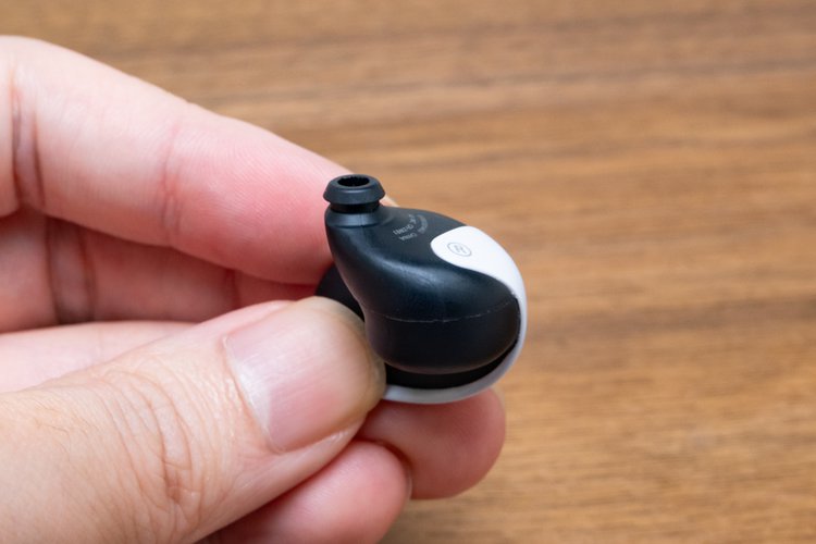 ポイントは耳穴側の形状だ。ハウジング自体がイヤーピースのように耳穴の形状に合わせたカーブを描いており、先端に行くほど急激に細く、平たくなる。先端には小さなシリコンイヤーピースを取り付けて、耳の奥をピンポイントで塞ぐ。他のソニーブランドの完全ワイヤレスイヤホンとはまったく違う形状で、密閉感を確保するようになっている。