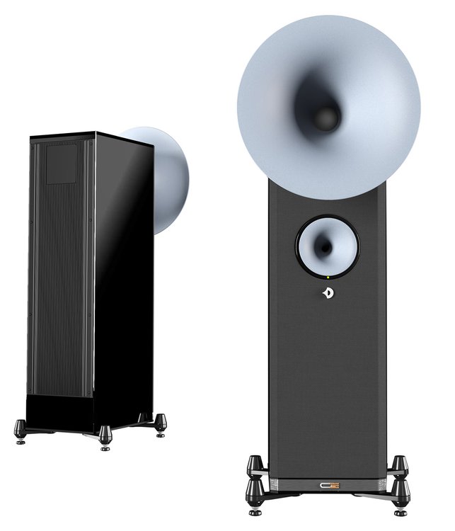 今回は、3機種のうち中核モデルとなるDUO SDを紹介しよう。まさにアヴァンギャルドな美しいホーンが印象的で、上部に口径67cmのスフェリカル・ミッドレンジホーンを配置。その下部に口径20cmのトゥイーターホーンを配置し、その下部には、30cmウーファーユニットを配置した。