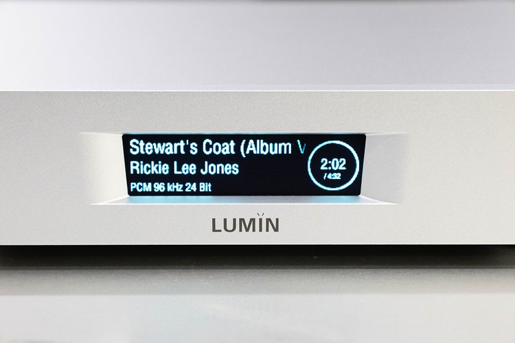LUMIN Appは多機能ながら操作性が秀逸。本体のディスプレイはサイズこそミニマムだが、曲名、アーティスト名、信号フォーマットなどを同時に表示し、コントラストの高いブルーの文字は鮮明で見やすい。