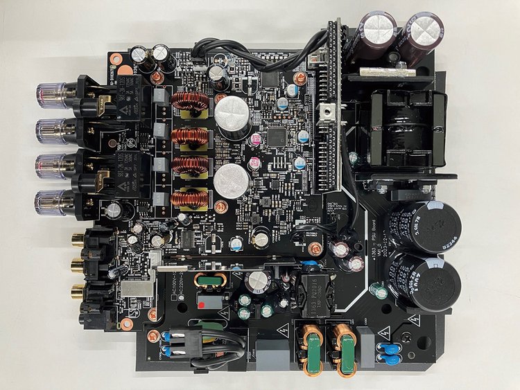 マランツはAxignの特長と機能に注目し、回路を共同設計することで4基のパワー素子をBTL接続、大型スピーカーを余裕でハンドリングする100W/8Ωの大きなパワーを引き出した。ほとんどのオーディオアンプが歪みを消すためにスピーカーからのフィードバック(帰還)を利用するが、M1はアンプの最終段のスピーカー出力直前の電流センサーからパワー素子前段のDSPにフィードバックをかける。これも新素子との出会いで実用化された着想だ。