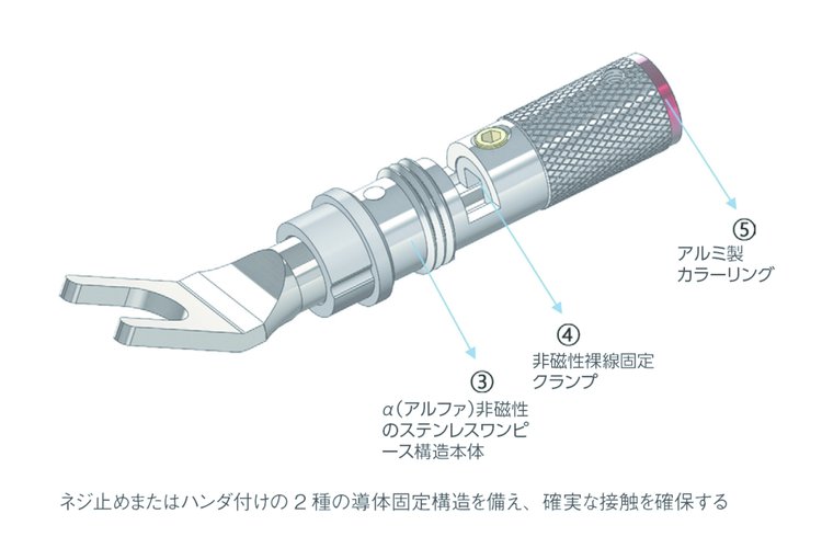 この構造の特筆すべきことは、ケーブル導体が接触する中心導体部にα純銅素材を、そして非磁性ステンレス材のクランプによって銅合金止めネジとしたことだ。