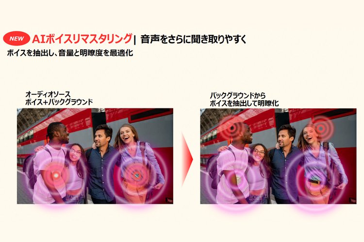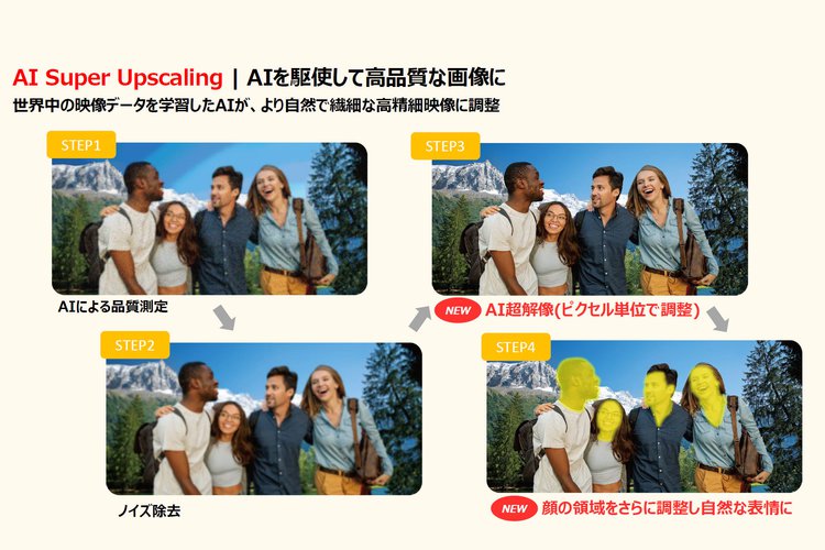 「AIスーパーアップスケーリング」では、ピクセル単位でより繊細な処理を施す「AI超解像」や人の顔の領域に自然な別処理を行う「ナチュラル表情エンハンサー」を実装。映像の立体感を高める「オブジェクト型リアルタイム映像処理」では注目する対象をAIが判別する処理や、配色理論に基づきながら製作者の意図や感性を組んだ色調整を行う「AIディレクター処理」といった高画質機能が搭載可能となった。