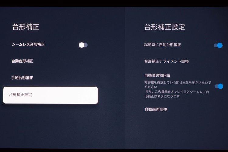設置性を向上させる機能も豊富であり、「自動台形補正」や「オートフォーカス」はもちろん、映像を投写する壁に棚などの障害物があった際に自動で回避して映像サイズなどを調整してくれる「自動障害物回避」も搭載。リアルタイム台形補正は45%、オートフォーカスは54%ほど、前モデルから補正の速度がアップしている。