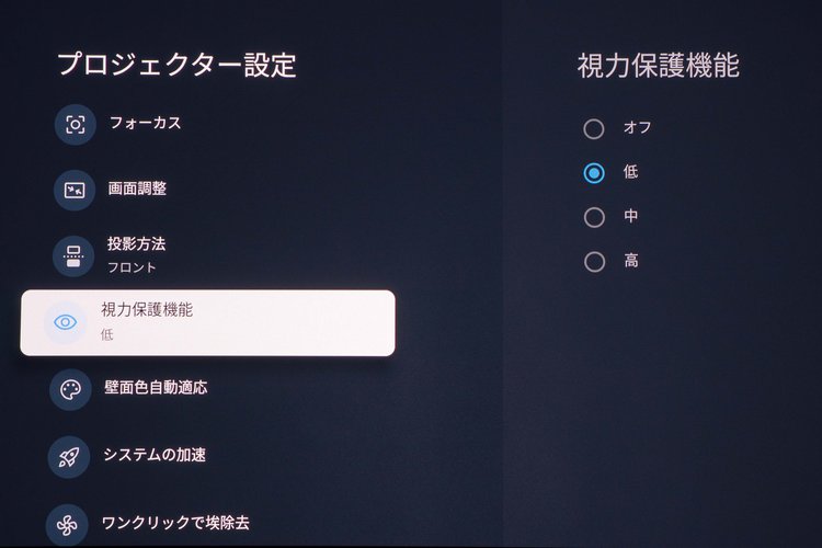 投写面の環境により最適化する機能として、ホワイトやグレー、ベージュなどどのような壁色でも適した色味に自動調整する「壁面色自動適応」、そしてスクリーンサイズに対して自動で投写映像サイズを合わせる「自動スクリーンフィット」といった機能も装備する。また、プロジェクターの前を遮ると自動で明るさを抑える「視力保護機能」も搭載している。