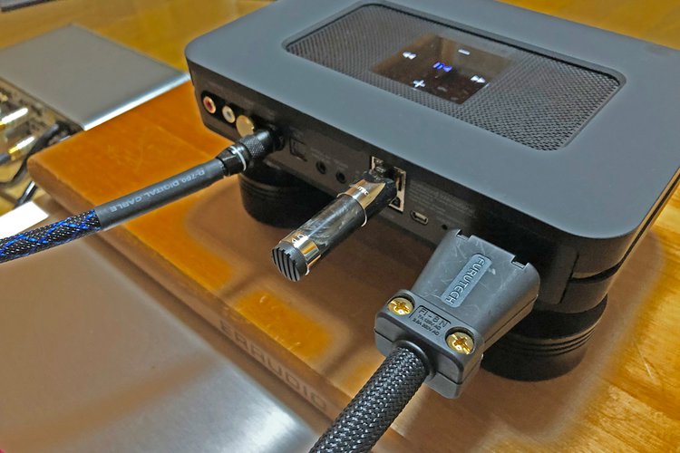 今回は、ネットワークトランスポートとして使用している、BLUESOUND「NODE 2i」のLANポートに挿してみる。Amazon Musicで聴く竹内まりやの「マンハッタン・キス」が、いきなり激変! レンジが高低に気持ちよく伸び、鮮度感がアップ。ぼやけ気味だったヴォーカル音像の周囲もスッキリ。