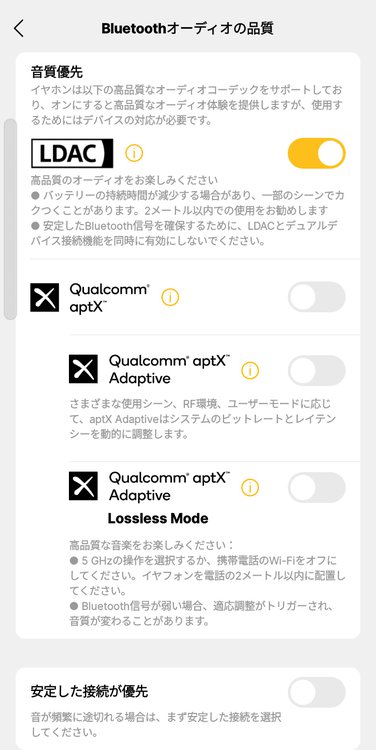 LDACによるハイレゾワイヤレスリスニングを始める前に、EarFun Audioアプリから「Bluetoothオーディオの品質」に入り、音質優先の接続モードとしてLDACをオンにして切り替える。デフォルトではaptX系のコーデックがオンになっているからだ。またLDACをオンにする場合、アプリからデュアルデバイス接続(マルチポイント)は引き換えとしてオフにする。