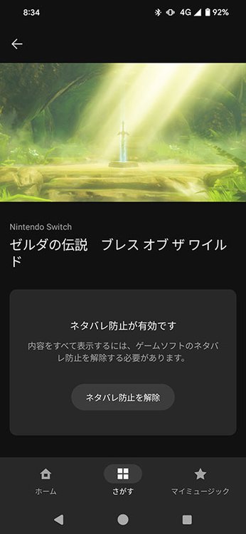 ネタバレ防止をオンにすると、指定したソフトの楽曲すべてが再生できなくなる。個人的にはエンディングなどの一部楽曲を隠すだけでもいいようにも思うが、そのゲームを始めたばかりのユーザーが先の展開を知ってしまわないようにするためには全楽曲を隠してしまったほうがよいという配慮なのかもしれない。