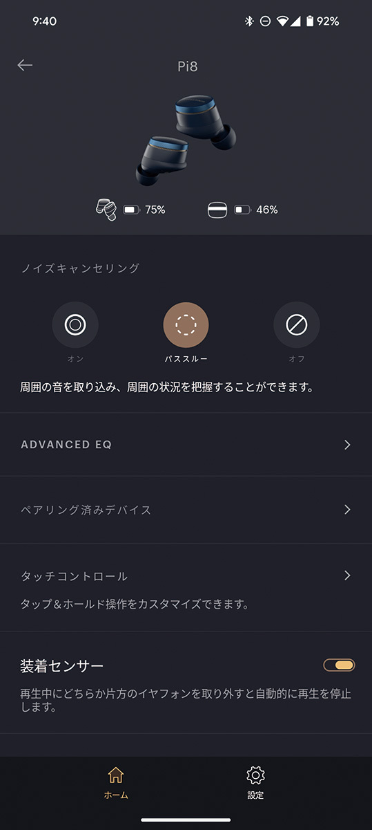 耳に挿入したイヤホンがまるで自分の身体の一部になったみたいに馴染む。パッシブな遮音効果も高い。加えてANCをオンにすると柔らかな静寂に包み込まれる。ANCのチューニングはPi7 S2と比較して低音域のキャンセリング性能を大きく向上させているという。だからこそ、静かなオーディオルームでスピーカーのサウンドに耳を傾けているような自然な開放感が得られるのだ。