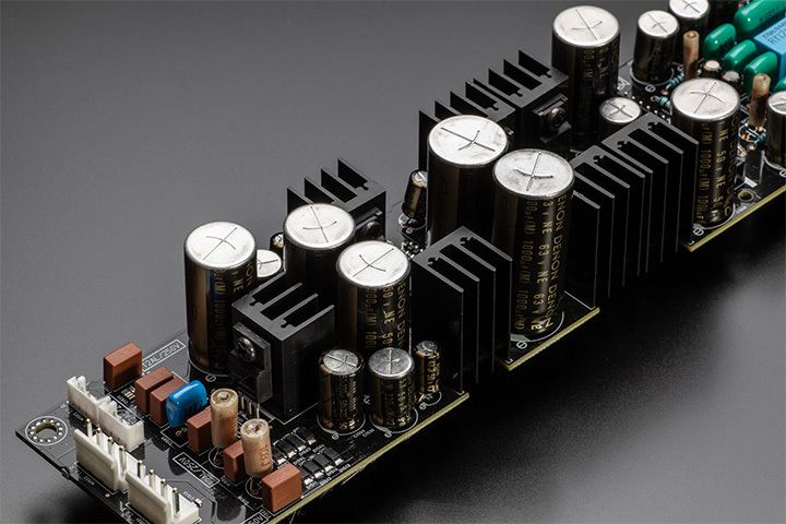 電源部では各セクションの配置を見直している。デジタル電源部とアナログ電源部を独立させ、プリ部の電源部はシャーシに直接マウント。音質を大きく左右するカスタムブロックコンデンサーを本機用に新規開発した。ショットキーバリアダイオード(整流デバイス)を並列化し低インピーダンス化した。各部基板の多層化とバスバーでパワーアンプ用電源からスピーカー出力まで接続しひとつのカタマリのような構造とした。
