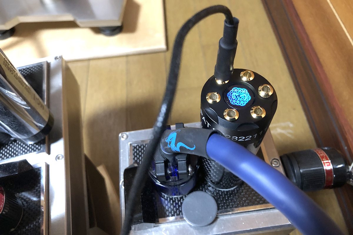 オプションの「ACXR GROUND CABLE」のバナナ端子側を「ACXR」本体に6つある穴のいずれかに挿し、RCA端子側をシステムの任意の空きRCA端子に挿すと、オーディオシステムの異なる電位差を「ACXR」で統一しノイズを抑えるというので試してみる。