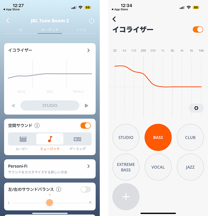 上述したJBL Headphonesアプリには、TUNE BEAM 2のサウンドをユーザーが自由にアレンジして楽しめる機能が揃っている。まず「スマートオーディオ&ビデオ」はオンにして楽しみたい。スマホなど送り出し側機器との接続安定性を保ちながら、音楽再生時には音質を重視、動画再生時にはリップシンクのパフォーマンスにも妥協しないワイヤレス再生を実現する機能だ。