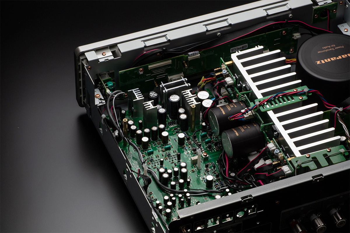 機構面では、ダブルレイヤードシャーシを採用し、アルミニウム押し出し材のヒートシンクに取り付けられ、電源回路まで一体となったシンメトリカルレイアウトのパワーアンプがユニークだ。MODEL 30nに始まる新世代マランツデザインを纏い、リブ入り高密度インシュレーターが筐体を支える。DACにESS ES9018K2Mを搭載、入力ソースにより異なるが、最大PCM384kHz/24ビット、DSD11.2MHzまで対応する。HDMI ARC入力一系統を装備のほか、HEOSに対応。Amazon Music HDをはじめとするストリーミングサービスが再生可能だ。