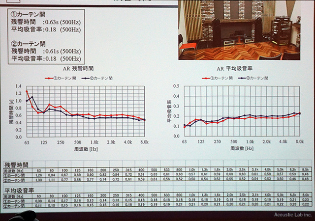 当日は部屋に吸音材を設置したり、吸音カーテンを閉めたりして吸音状態を調整。実は残響時間にして0.3〜0.4秒とほんのわずかな変化なのだが、それでも音楽の印象が意外と大きく変わる。残響時間、つまり部屋の響きがオーディオ再生に与える影響の大きさをたしかに体感できるデモだった。