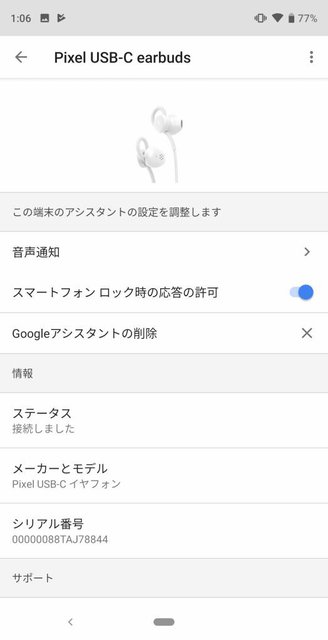 最初の接続時は、GoogleアシスタントアプリでPixel USB-Cイヤホンのセットアップを行う。イヤホンを接続し、ホームボタン長押しでGoogleアシスタントアプリを起動。その後、表示される手順通りにセットアップを行うと、設定画面の「アシスタント デバイス」欄に表示され、設定完了となる。