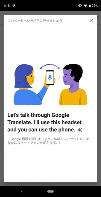 自分が話すときはリモコンマイクの中央ボタンを押しながら喋り、相手は画面右下のマイクアイコンをタップしてからスマホのマイクに向けて話しかけてもらう。すると自分の話した内容はスマホのスピーカーから、相手の話した内容はPixel USB-Cイヤホンから、それぞれ合成音声で翻訳されたものが聞こえるという仕組みだ。