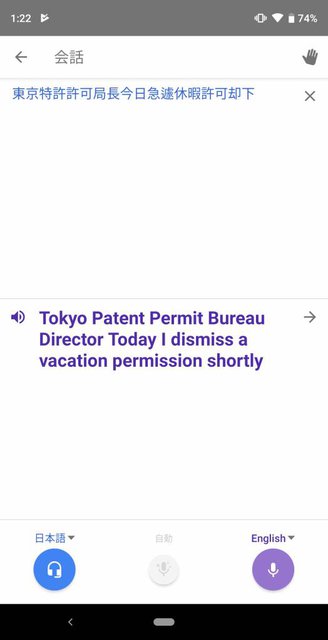 このあたりで、既にスマホ版Google翻訳を使いこなしている方は「別にイヤホン無くてもスマホだけで使えるじゃん」というツッコミを入れたくなる事と思う。その通り、2カ国語翻訳自体はスマートフォン単体でも使うことができる機能だ。この場合、お互いに画面のマイクアイコンを押し、スマホ内蔵マイクに向かって話しかけることになる。マイクアイコンを押すのが面倒であれば、どちらが喋ったかをアプリに判別させる「自動認識モード」も使うことができる。