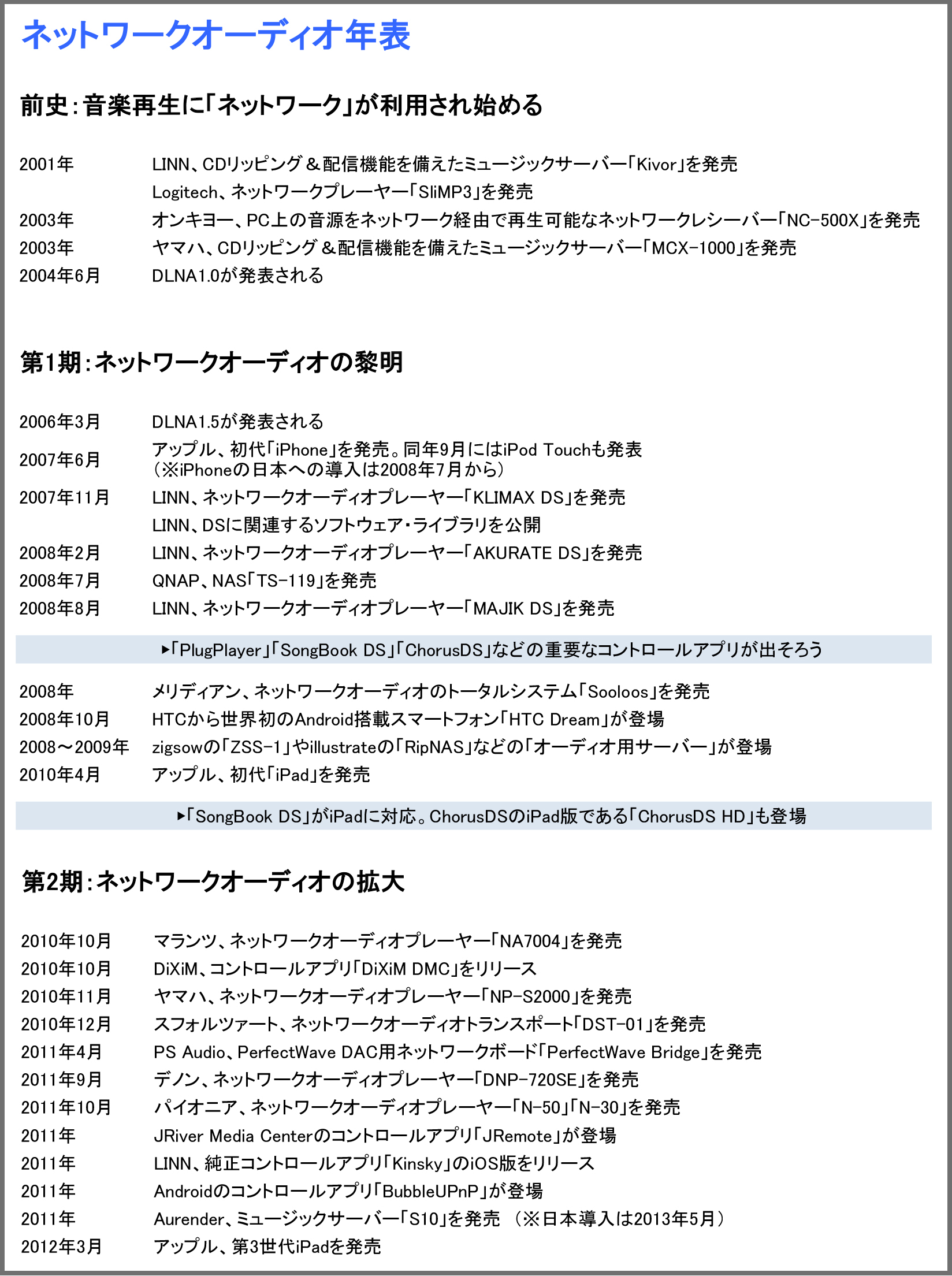 なお、この記事で扱うのはあくまでも「ネットワークオーディオの歴史」であって、「PCオーディオの歴史」でも「ファイル再生の歴史」でもないということは留意していただきたい。また、年表中の日付は可能な限り正確を期したが、古いものほど情報を追うことが難しいこともあり、多少のずれが生じている可能性がある。