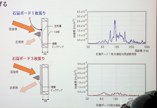 音楽再生にとって現代住宅の壁がデメリットになるのはなぜか? それは「軽くて振動しやすい」という点がまず第一に挙げられる。壁の内装材に使われる石膏ボードのような軽い面材では、振動が原因の「コインシデンス効果」が起こって遮音性能が低下するばかりか、二次音源として空間に放出される。そして、それが特に中高音域のカラーレーションにつながるのだ。