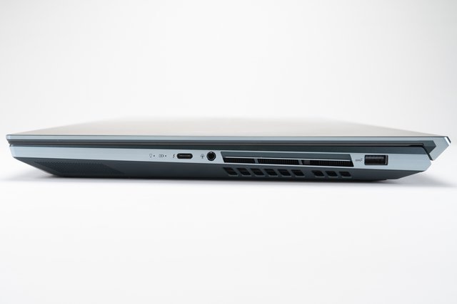 この4K有機ELディスプレイでAV的に特筆すべきは「DisplayHDR 500 True Black」に準拠している点。これは、たんにHDR信号を受けられるだけに留まらず、輝度や色域、応答速度などのスペックがHDRのポテンシャルを一定以上引き出せる水準にある、と業界団体のお墨付きを得ていることを意味する。実際、コントラスト比100,000:1、応答速度1ms、視野角178度、色域はDCI-P3 100%/sRGB 133%をカバーといった数値は、ノートPCのディスプレイとしては破格と言っていい。見た目も、ベゼルが狭く映像への没入感を妨げないデザインとなっている。