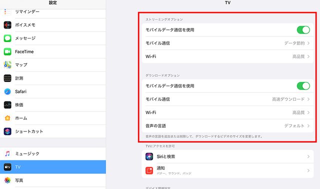 iOS 13.4/iPadOS 13.4からは、Apple TVアプリの設定を開くと「ストリーミングオプション」と「ダウンロードオプション」が選べるようになった。Cellular+Wi-FiモデルのiPadの場合は、モバイル通信を使ったストリーミング視聴とコンテンツのダウンロードを許可するかどうかも選べる。