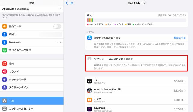 ダウンロード済みのコンテンツを端末から消去する時には、iPadOSの「一般」設定から「iPadストレージ」を開くと、「ダウンロード済みのビデオを見直す」というメニューが並んでいる。以前はさらにApple TVアプリを選択しないと見られなかったため、階層が一つ上がった格好だ。見終わった作品やエピソードをここから削除もできる。
