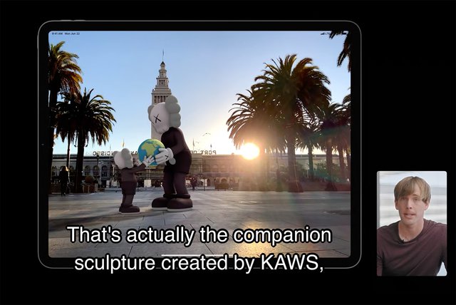 このロケーションアンカーを使った例として、サンフランシスコのベイエリアの街並みをマップに表示しながら、世界的アーティスト・KAWSのARフィギュアをあたかもその場所に存在するかのように配置するデモンストレーションが紹介された。