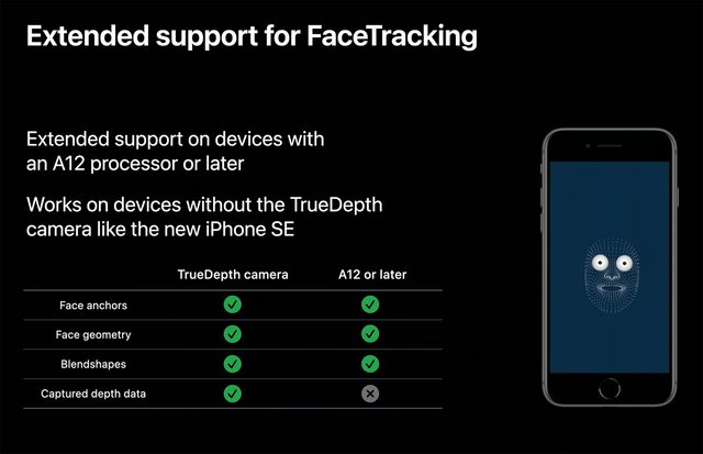 またARKit 4に含まれるフェイストラッキングにより、A12 Bionic以上のSoCを搭載するアップルの端末であれば、TrueDepthカメラを搭載していない第2世代のiPhone SEなどの機種でもアニ文字のアニメーションを作成し、使えるようになる。