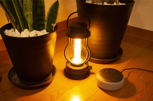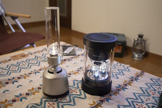 音声はプロジェクター本体からも流せるが、今回はソニーのLSPX-S2と、バルミューダ ザ・スピーカーをBluetoothスピーカーとして使用。どちらも360度再生ができるので、音を部屋中に広げてくれるのがポイント…だが、それだけじゃないのが2モデルの魅力!外観からわかる通りライト機能が特徴で、キャンプ感演出にもってこいの秀逸さを備えている。