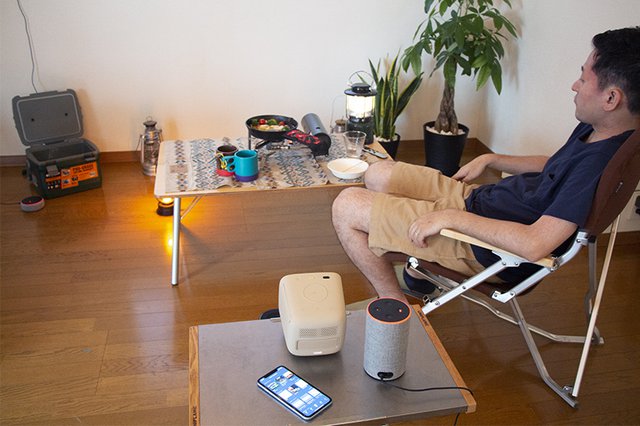 そこで用意したのは、BenQのモバイルプロジェクター「GS2」、ソニーのグラスサウンドスピーカー「LSPX-S2」とバルミューダのBluetoothスピーカー「バルミューダ ザ・スピーカー」、Amazon Alexa対応のスマートスピーカー「Echo」&「Echo dot」。具体的には、自前のスマートフォンとノートPCと連携して、プロジェクターで映像を、Bluetoothスピーカーで音楽や映像音を再生し、スマートスピーカーは周囲に配置して、川のせせらぎや虫の声などを流すことで、リアルな空間作りを目指している。