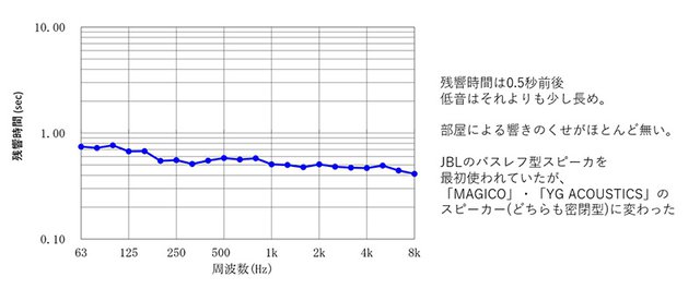 この部屋の残響時間は0.5秒前後で、低音はそれより若干長めに仕上げられた。「部屋による響きのクセがほとんど無いのが特徴です」とアコースティックラボの担当者は説明する。