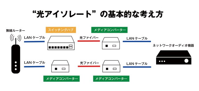 ネットワークオーディオの世界では、ルーターからのノイズを遮断するという意味でネットワークハブの導入には大きな意味がある。オーディオグレードのハブも多く登場してきており、たとえばEnglish Electricの「8Switch」、NuPrimeの「Omnia SW-8」などが知られる。また業務用ユースのM12コネクタを活用したテレガートナーの「M12 SWITCH IE GOLD」も30万円を超える弩級のハブだが、発売以来ロングセラーを記録している。ただし、これらはすべてメタル導体のケーブルを利用しており、 “光アイソレート” には利用できない。