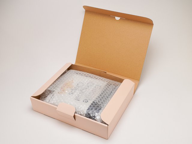 そんな内箱を開けると、丁寧にエアパッキンに包まれたポテチのパッケージがお目見え。さながら新しいデバイスを開封する時のようなワクワク感。シンプルなデザインが非常にスタイリッシュだ。右下には任意の名前がローマ字で袋に印字できるとのことで、媒体名「PHILE WEB」と刻まれている。これは開封するのがもったいない…。