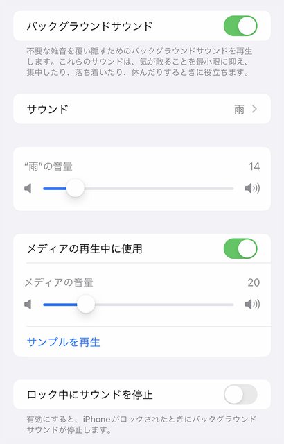 こんなときに便利なのが「バックグラウンドサウンド」だ。その名の通り「バックグランド=背景」音を再生するもので、アップルでは「不要な雑音を覆い隠すためのバックグラウンドサウンドを再生します。これらのサウンドは、気が散ることを最小限に抑え、落ち着いたり、休んだりするときに役立ちます」と説明している。